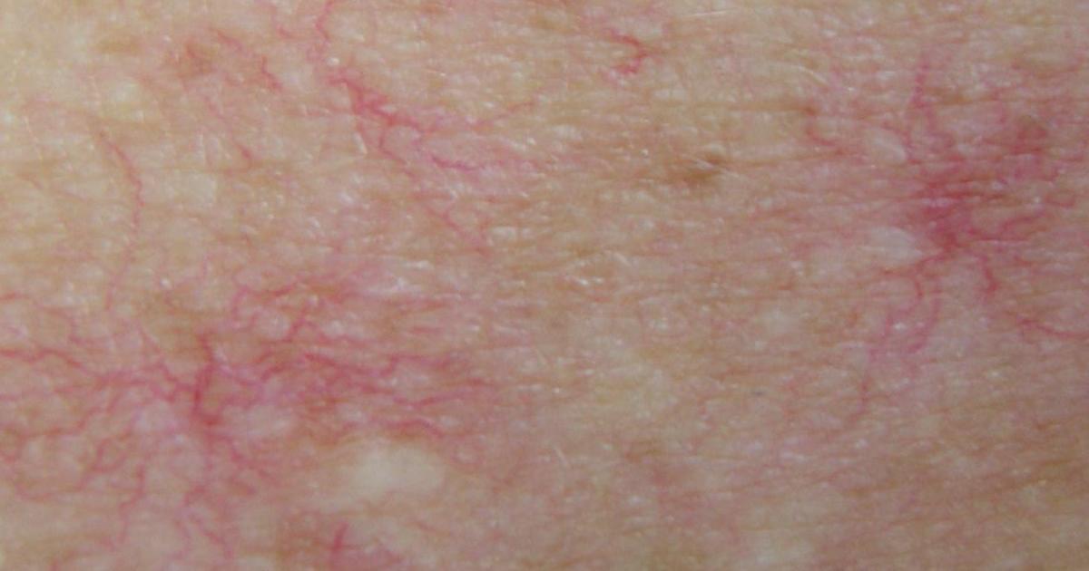 Spider angiomas are generally a sign of liver disease, one of the main components of Wilson's disease. Also known as spider veins, spider angiomas are clusters of dilated blood vessels located very close to the skin's surface. The clusters form a web-like shape, and the vessels may be red, blue, or purple. When pressure is applied, the clusters disappear, and they will reappear after pressure is released. While spider veins may occur anywhere on the body, they typically form on the face, neck, and legs, and they may cause discomfort. Discomfort is most likely if the spider angiomas are present on the legs, and pain may become worse after standing for long periods. Individuals who have multiple spider angiomas should make an appointment with their primary care physician as soon as possible, especially if they also have yellowing skin or eyes, or feel fatigued, weak, or bloated. All of these symptoms could indicate possible liver problems.